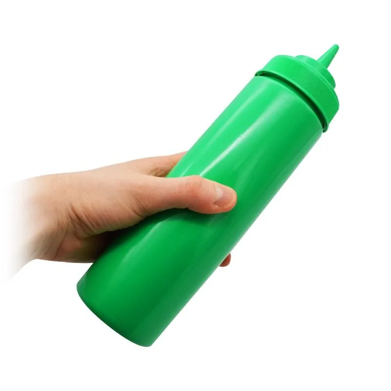 The squeezable body and narrow tip allow precise portioning, while the green cap ensures easy identification and reduces service errors.
